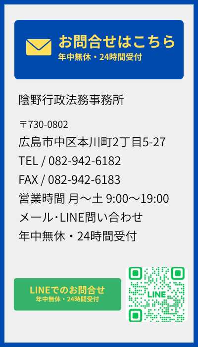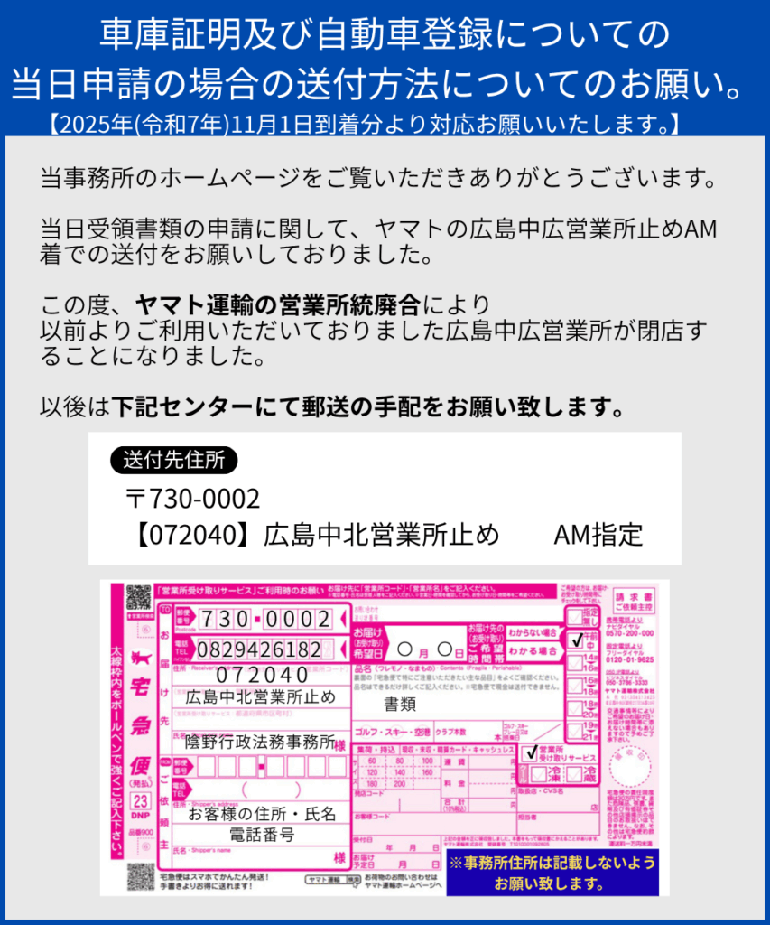 自動車登録はお任せください!! ■陰野行政法務事務所だからできる事■ 私たちは、創業20年の自動車登録の専門家です。 煩雑な自動車登録業務に関するお悩みは、当事務所が解決いたします。 車庫証明取得代行 丁種封印再々委託 出張封印代行 普通自動車各種登録 軽自動車各種登録 広島ナンバー以外の登録 二輪車(バイク)各種登録 公式LINEからもご依頼・お問い合わせ・ご相談ください。